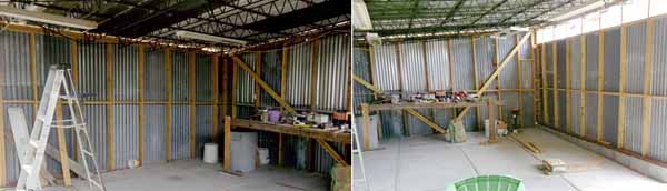 | I finally finished putting the skin on the shed. I procrastinated that job because it was so nice being in there on hot days. That much shade coupled with an almost continuous breeze was pleasant. It would have been perfect for a outside bar-b-que. But the approaching rainy season put an end to those thoughts, and I did what had to be done. Getting the siding to bend around the corners was a bit of a trick, but a chain and a come-along can work wonders. I have not yet hung any doors. |