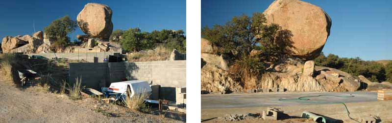 | As you know, Jerry is attempting to become my neighbor by building a house that almost touches "big rock." Thursday Morning at about 0430 I was awakened by the melodious roar of a cement truck engine accompanied by the clang of the backup warning device. If I were a good neighbor, I would have arisen and offered to help (and the thought did cross my mind) but before I could get my feet on the floor, sleep had reclaimed me. I still can't envision how the house will look, but the "upper floor" is shown in the photo. |