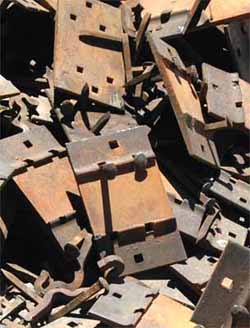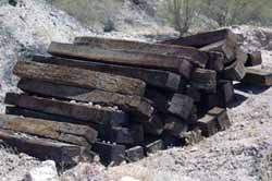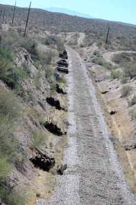 | Progress marches on, even when the direction is not particularly desirable. With the mine closed and flooded, the demand for rail service to and from it has dramatically decreased, and recently the SMRRC (San Manuel Railroad Company), being the environmentally friendly entity that they are, decided to recycle the rail (taxes on railroads are computed based on track mileage in place). In addition to memories, all that is now left is a few ties, some scrap iron, and one markedly elongated pile of gravel. |