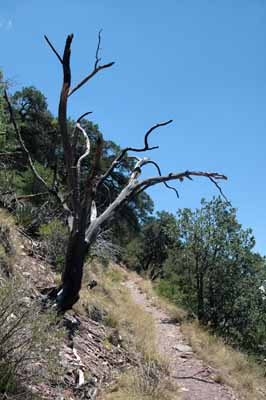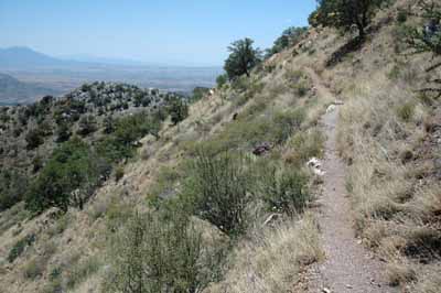 | Sunday afternoon, I took a short hike on the trail towards Miller peak (south of Sierra Vista). I am re-impressed with the steepness of Arizona's mountains every time I re-visit them, and this trip was no exception. The trail, however, wanders around enough that it has only few steep stretches. I calculate that I traversed two miles and climbed 1500 feet before my knees informed me that playtime was over. |