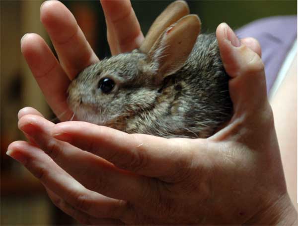 | For some unfathomable reason, the female of the human species seems to have a proclivity for not only their own young, but also the young of all species (It's soooo cute...). This little garden terrorist fell victim to Barbara's cat and, against all reason and logic, she rescued it, nursed it back to health, and turned it loose. If our garden hadn't already been decimated by javelina, this would insure its demise. |