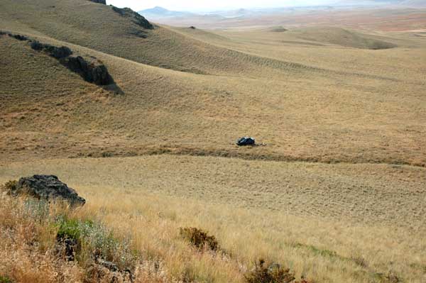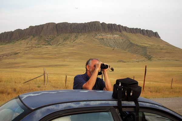 | July 19-22, David Ellis and I traveled to Montana to look at eagles aeries. It was a lightening trip, and a dry run (without peaches) for my upcoming attempt to complete the Mexico to Canada bicycle trip. Dave also explained the fundamentals of how to capture an eagle (in the unlikely event that I should ever want to do so). The opportunity to attempt it did not present itself on this outing. Here, Dave is looking at eagles on the horizon, while an eagle (barely visible over his right shoulder) is looking at him. |
