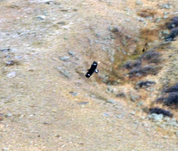 We were probably two weeks too late to see them in the nest, but we encountered several juvenile birds that had fledged, but were not yet cleared for hunting. The white spots on the wings and white stripe on the tail identify them as this year's young. By the end of the second or third molt (basically one per year) these spots will disappear and they will take on the plumage of an adult. How many times have you looked down on an eagle in flight? |