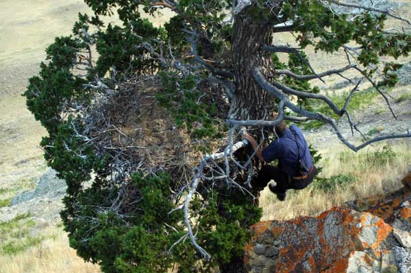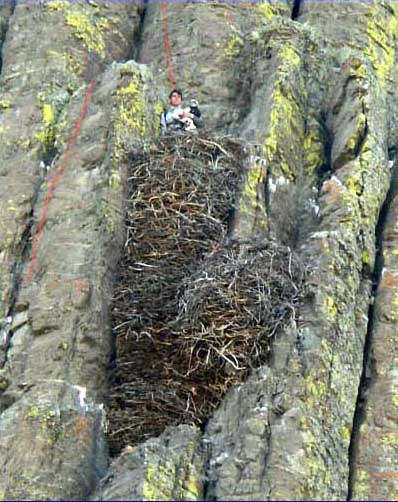 | Dave has a presentation at an upcoming meeting, and wanted a photo, so he climbed into this nest in a tree against the side of a cliff. The photos of him in the nest are from his camera. |