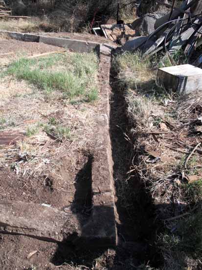 The existing foundation had been buried in a couple of places. It is hard for me to really believe it, but almost a foot of dirt has washed into the space between the shed and the rabbit house, slowly on a human time scale, but instantaneously on a geological one.