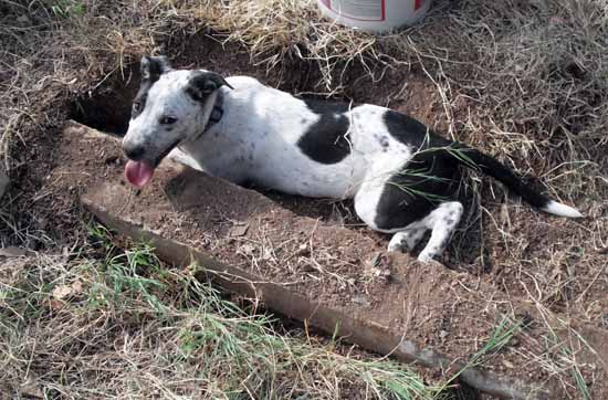 The only "help" I got on this dig came from my puppy, who dug furiously at any dirt I happened to get on my shovel, and then lay down in the cool, damp, trench. Barbara has taken to controlling the cat using a squirt bottle filled with water. I attempted the same with the dog. It was efficient at first, but within a short period it became a game, and he was attempting to drink the squirts. He doesn't like being in the sun in the heat of the day, so I was able to work sans his "help" during that time interval. In the final analysis, he was about as helpful as any normal three-year-old child.
