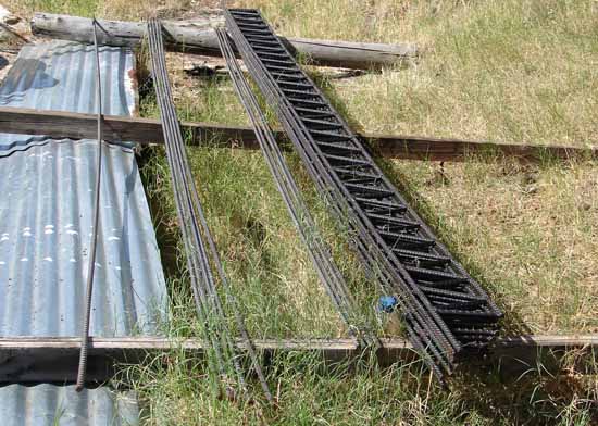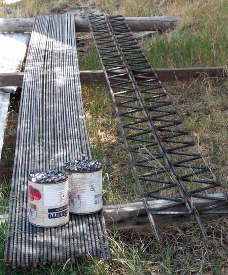 At any rate, I cut some of the stuff up and started welding. I decided to construct this set of joists out of half-inch rebar. The roof I built using 5/8 rebar doesn't give a millimeter when I walk on it, suggesting that it is over built. Besides, my source for cheap #5 rebar dried up and #4 rebar is much easier to work with.
