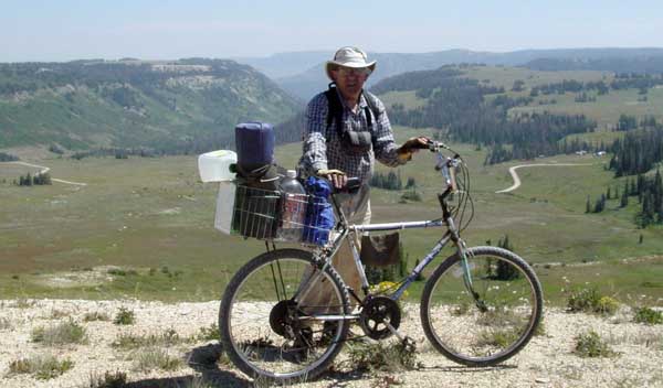 | I started the trip with 52 pounds of provisions, but the bicycle was so unstable that I could hardly keep the rubber side down. So I dumped 16 pounds of water and things worked much better. We re-supplied our water from a roadside spring on the afternoon of the second day (after consuming about half of our food), and suffered no ill from jettisoning the weight. |