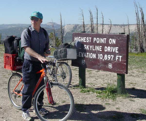 | For the second time, Dave Elliot and I bicycled along a section of Skyline Drive, a series of roads and trails that run south from the Utah/Wyoming border, and end in St. George, Utah. We chose to start at the highest point. (Why would anyone ride uphill any more than is absolutely necessary?) |