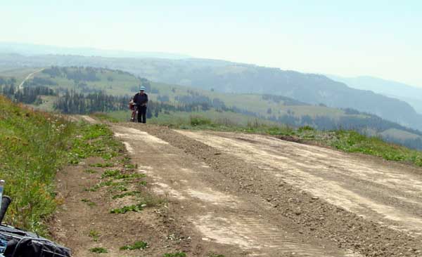 Unbeknownst to us, the state of Utah had scheduled their seasonal bow hunt for deer during the time we were riding. It seemed like there were hunters posted at about 100 yard intervals. Notice the ones on the brow of this hill. In addition, teams of them putted along riding 4-wheelers. For those of you who have an aversion to Bambi-Burgers, you will be happy to know that we did not see a single deer in the area, hanging or otherwise. I suspect the success rate for archery is less than a single percentage point. |