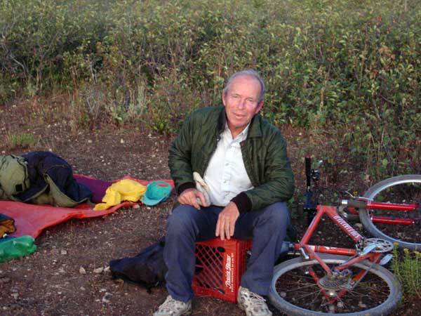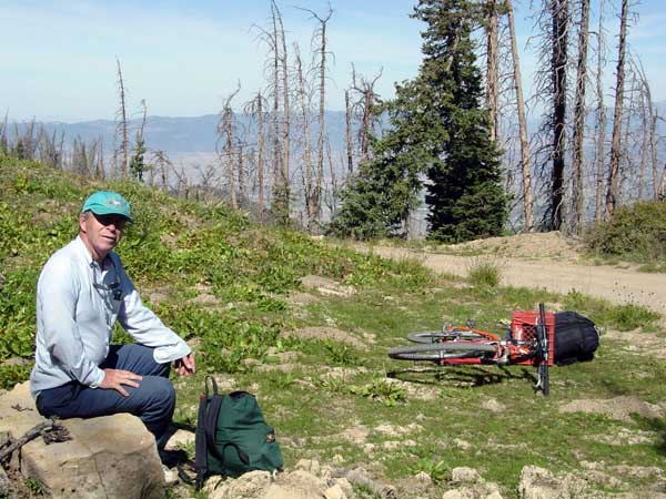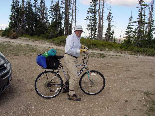 | I tried to limit the weight I carried, but still ended up with more than I wanted. My bike weighs 42 lbs and my gear with food, four liters of water, and sleeping gear weighed another 26. I borrowed a sleeping pad from Dave (after my efforts to acquire one on Ebay proved futile), and I estimated its weight as 3 lbs. I didn't weigh the backpack with a map, camera, and other small items. In all, it was sufficient to make pushing the bike up hill (which we did a fair amount) strenuous. The sad truth is that simply being at an elevation greater than 10,000 feet makes lying in the shade strenuous for this old man. |