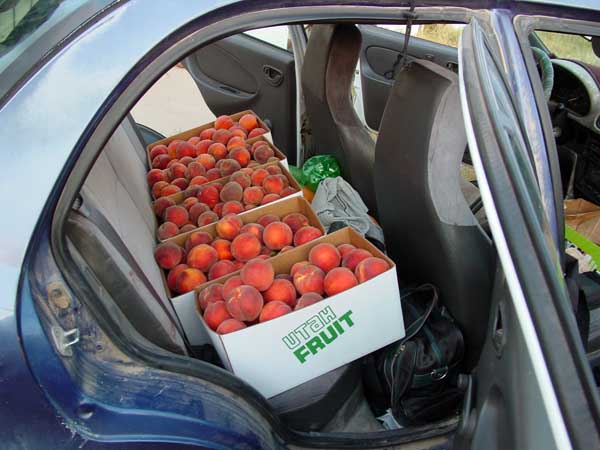 I also brought a few peaches home. Getting them was an adventure in itself, but that's a story for another time. Because of the construction on the eastern route through Moab, I chose to return via the western route through Flagstaff. The little car traversed the 1524 miles without missing a beat, and turned in 45.3 mpg for the trip. That's not too bad, considering that it had a bicycle hanging off its back disrupting the aeordynamics and creating drag. |