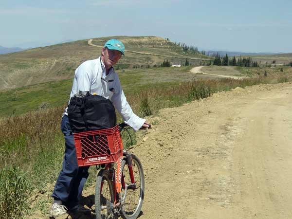 | Historically, Dave and I almost always have mechanical problems on our adventures, but this time the cars and bicycles functioned almost flawlessly. Dave did have a little trouble with his hands, shoulders, and neck from leaning over and looking up while supporting his upper body over his handlebars. My bike looks funny, but sitting in an upright position minimizes the pressure on those body parts. |