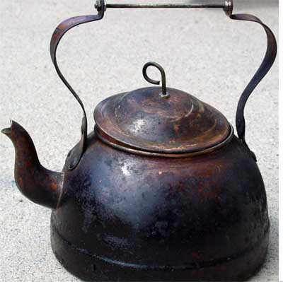 Boiling water over an open fire can be challenging especially if you dislike ash in your food. I solved the problem by taking a small, cheap, copper teakettle and replacing its wooden handles. This sat right on the fire and, although it got black and tar covered, it heated water quickly with very little ash contamination. It probably says something when a person is impressed by their own ingenuity, but I'm not sure what... |