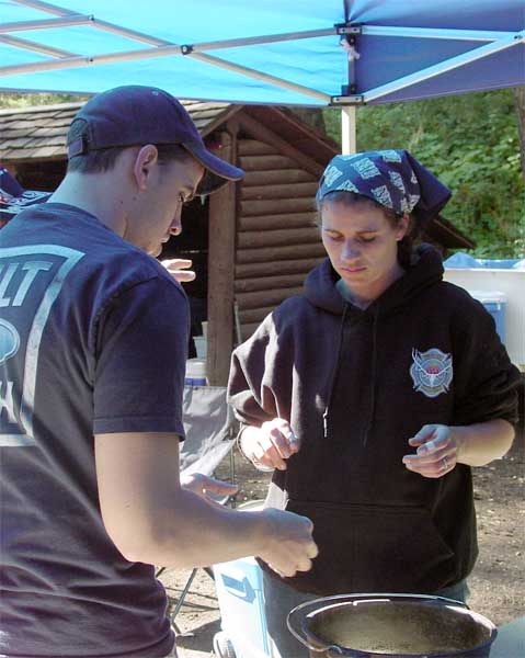 | Ameilia was the lone brave soul that cooked using a dutch oven this year. AJ, who finagled the dessert assignment, wanted to use mine, and after I was packed to leave, informed me that he had changed his mind about needing them. |