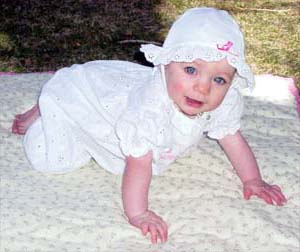 Abbie, not wanting to be left behind, seems to be trying very hard to catch up with her big brother. She loves to watch him and they are really cute playing together. He was tickling her tummy the other day and she was laughing, it was really cute and we even got it on film so we can prove to them that at one point they liked each other. She is sitting very well and trying really hard to start crawling. I am afraid that it won't be much longer for us before they are both fully mobile. She loves food of all kinds and will eat anything she can get her hands on. As her brother likes to share with her we have to keep an eye on things or she ends up with things she can't eat yet as she doesn't have any teeth. For example this week on top of baby food she had a chicken nugget, an orange slice, tortilla chip and chocolate bar (all compliments of her brother). She is also loving to be outside and has had a couple of handfuls of grass to go with every-thing else. She also seems to be growing at top speed. She is full of smiles and giggles and is just a fun baby.
