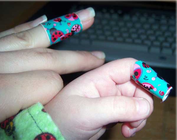 | Lauren is very curious of small holes and likes to stick her finger in them. She did just that to a can and found out the hard way that can lids can be sharp. The funny things was that two days earlier I tried to zest off my knuckles. Then two days later Zeke cut his finger on a piece of glass so we were sporting band aids. Zeke opted not to join in on our Ladybug party. |