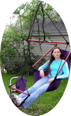 While in Germany I was sent a swinging chair. I had no where to put it up until now. It is hanging from a tree in our back yard it was a lot of fun until I got sick from spinning so much. The directions say that the swing should be hung inside but I think this is probably the best spot for it.