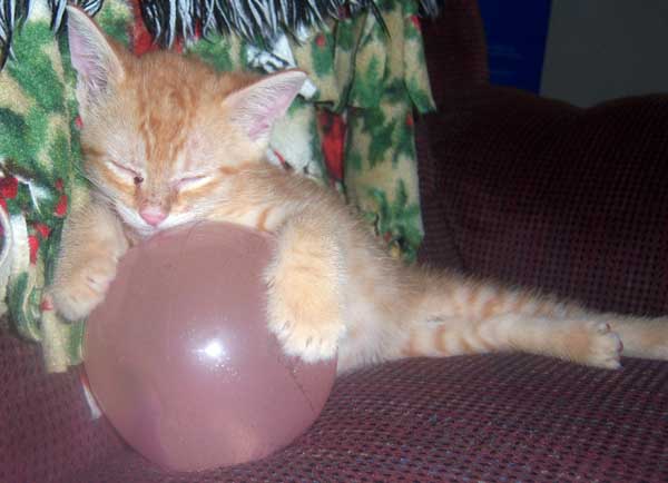 | He slept with Lauren while she was sick and still most nights is in her bed. His name was Goliath; however I could not seem to remember that to call him. So then it was RD for rubber ducky. Lauren picked that one out. Now it is Doc. We will see if this one stick--so far so good. Lauren adores him and asks daily to take him to see Rachael's kittens. | ![]() |