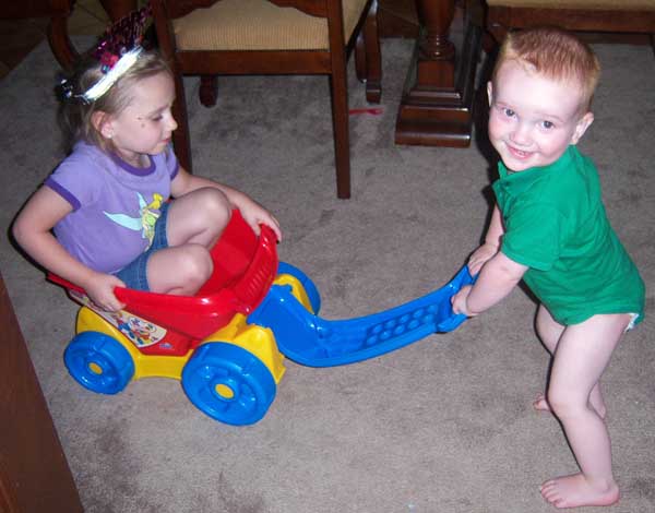 | Lauren has a good friend who has a bike and so we decided that it was time to get out kiddos bikes. Zeke found a tricycle on Craig List that was almost brand new for 15 dollars. Carson has not figured out that the paddles make it go. He prefers to push it along with his feet. He will also just stand up straddling the thing and walk. | ![]() |
