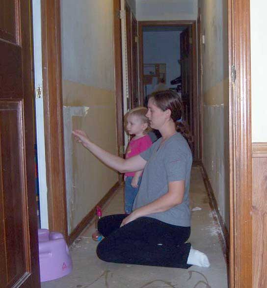 | AJ and Brittney were nice enough to help me with finishing the boarder in Lauren's room. I took paper dolls and paper ivy that I cut out on my nifty Cricut (a paper cutting machine) and with liquid starch adhered them to the wall. |