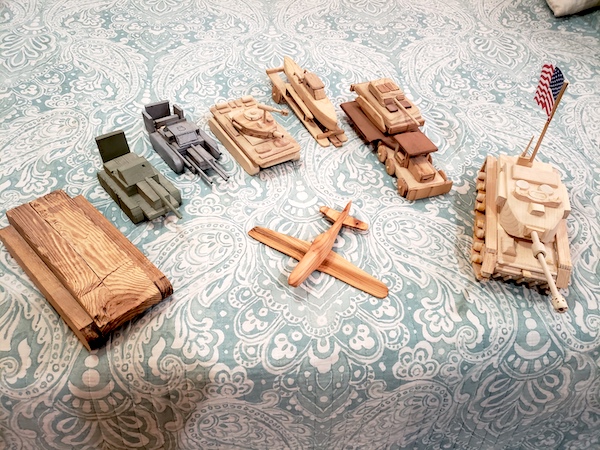 Each year for the past 7 years Kyle has made me a tank for Christmas. As you can see in the photo to the right the progression over the years as his woodworking skill have increased with time. Not last year, but the one before, he made a tank on a trailer with a truck to pull it and then he also built a boat with a trailer that could be pulled by the truck. They are neat to display. This last year he built me a P-51 mustang. This is the first one that was stained.