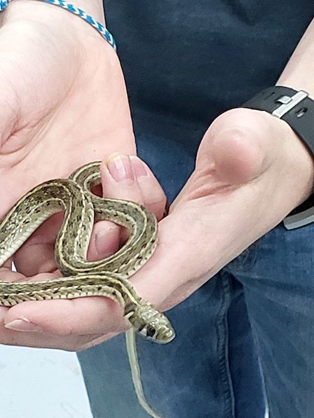 Below is a snake that happened to slither up on the driveway some random Saturday when we were headed out to the shop. It was cool outside and so the kids picked it up and played with it for a while. I believe that the snake wasn't too upset with the arrangement as it warmed up enough to slither off when they were finished playing with it. I am not certain, but it looks like some common garter snake variety. |