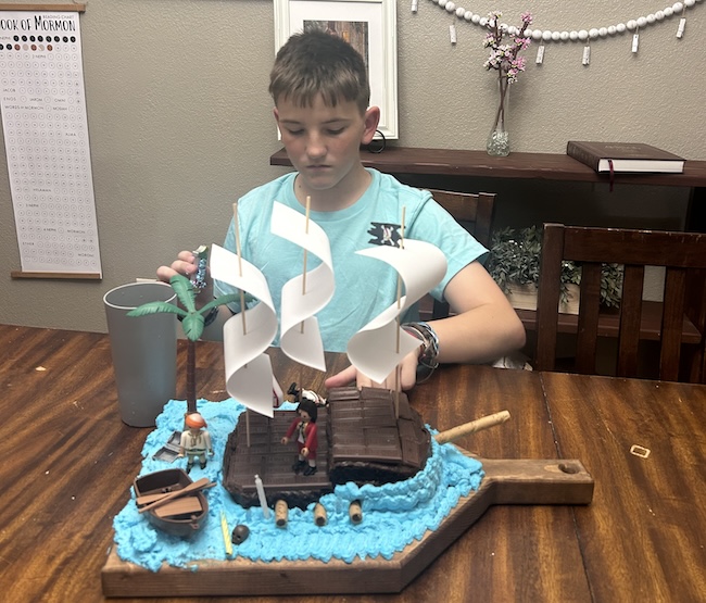 In the car Landen was doing magic tricks with his cards. Those in attendance were Lanen, Drake Fry, Canon Hanie, Case Larson & Gabe Davis. For his birthday cake, Terra made a pirate ship. |