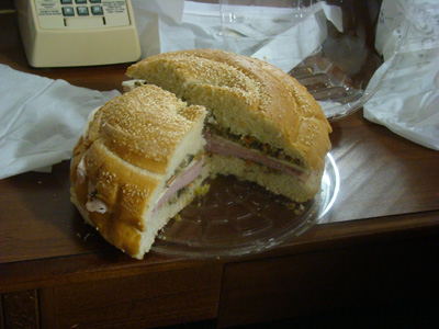 This is what is referred to as a muffuletta sandwich. After getting into New Orleans, it was dark, and we wanting to find our way to Bogalusa as fast as we could decided it best to eat after we found our way to our hotel. Once in Bogalusa we stopped at the local Winn Dixie (grocery store) and purchased a Louisiana traditional sandwich (also the only freshly prepared sandwich in the stores deli). It is a round sandwich and has sliced ham, turkey, and cheese on it as well as a mixture of carrots, olives, green olives, onions, and peppers all cut fine and in a pickled sauce. We decided to give it a try and taste the local culture, and the first quarter was rather good. After we weren't so hungry we tried the second quarter and both of us could hardly stand to eat it. It is amazing how good things taste when you are hungry. |
