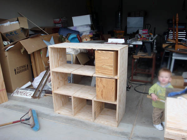 Sure enough, when I got the saw home, the same failure to start of the saw was present. I took out the bearings and found a new set of bearings at Bearing, Belt & Chain for $5.50 each, and after they were replaced the saw has never failed to start. So after making this saw work, I am no longer properly motivated to get the older one fixed. The whole reason that I wanted to get a table saw was so that I could fix the broken dining room table (seen here in the background), but once it was up and running, Terra had other ideas. She has wanted a shelving unit for years now for the kids to put their toys in. She is under the delusion that once the shelving unit is acquired, their room will miraculously stay clean. Well she purchased a shelving unit at Lowes - for $50 ish and it had 9 shelves (3x3 arrangement). Well Terra got it home and put it together (it was sawdust pressed with glue boards with plastic wood painted skin) and was very disappointed in its function. It was unstable, and wouldn't hold up to much abuse. The backing for it was a cardboard and Terra couldn't bring herself to putting it on. |