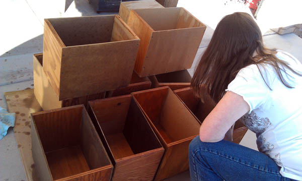 | After this failed to satisfy her desires for a shelving unit, she searched Craig's list and found someone selling some wooden boxes. They measured about 9.5" wide, 11" high, 15" deep. She wanted to put them into the old shelves, but the cubby holes weren't big enough, nor would they support the weight of the boxes. So the new project commenced. We went and purchased some plywood that was finished on one side and started to put the new saw to work. This shelving process has been going on for about 1.5 years. She had talked me into starting it when we were in Arkansas, and we cut some scrap plywood up to make some shelves. But due to our lack of supplies, we would have to make a shelving unit that was 1x3 cubbies. So now that Terra had acquired the new boxes (9 of them) we had to make the shelving unit big enough to hold the boxes.
