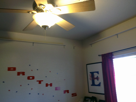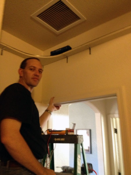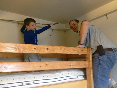Here Kyle is helping me layout the tracks and determine if we needed to cut down the track to make it fit. As it turned out, I had to cut down the tracks on three of the four walls. I know, I know - that doesn't make sense, but that is what happened. On the north and south walls, I had to add a piece of track that was 1.5 inches long to get the track to lay correctly. On the west wall it fell perfectly and I needed no non-standard piece to complete the track, so I assumed the east wall would be the same, and put the track down. Each piece of 9" track is screwed down to the boards by two screws (this is to keep it secured with the kids around). I fought and fought the closet pieces, but figured that was just due to the limited space I had to work in the closet. |