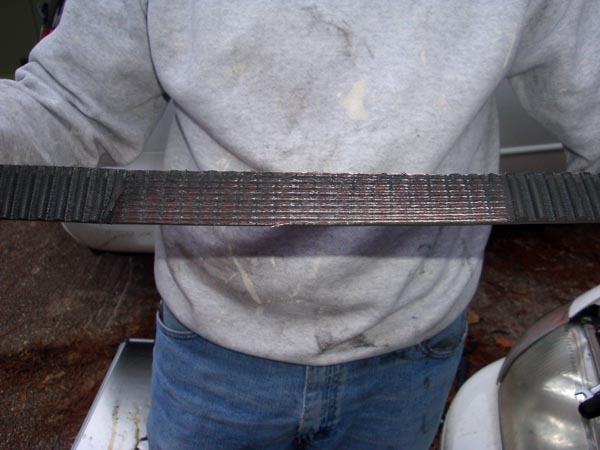 This may sound trivial, but when your fingers get cold it is hard to make them do the detailed work that is necessary if the loosening of bolts. Of course the sweat shirt and thermal underware helped out considerably. Once I had the head off and determined that everything looked good and the vehicle was indeed salvageable, then I started to disassemble the timing belt. From the top of the engine it looked just fine (as pictured above by the pistons) but something just didn't add up. It failed (and only after 16 months and 35,000 miles) and I wanted to know why. After pulling off the valve cover I could see that the belt had walked toward the outside of the engine and was rubbing on |