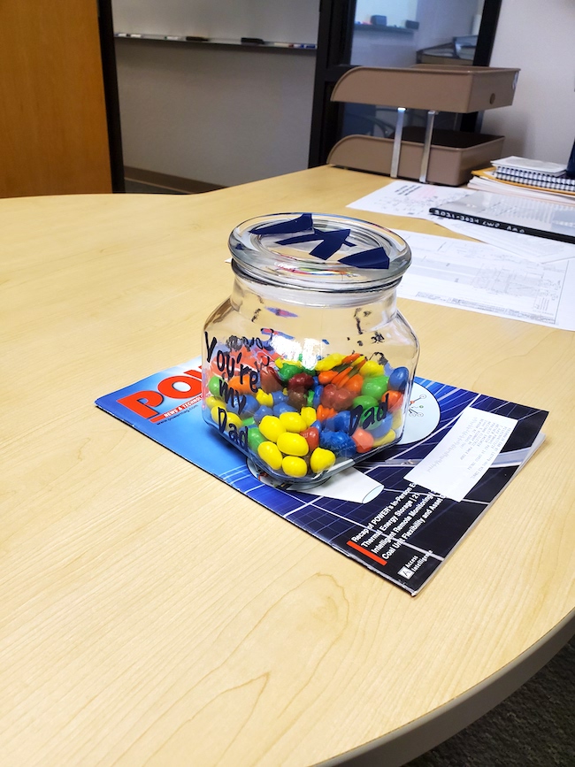 | Rachel made this for me. It is a candy jar that I keep at work. For some odd reason it doesn't stay full of M&M's for very long. |