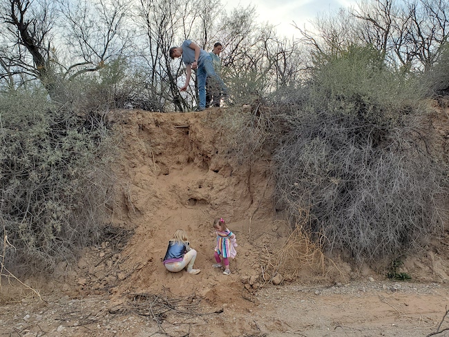 We have found a spot that we like to drive out to in a local wash to dig a fire pit, cook hot dogs and do some shooting. A few weeks ago we found a warm Saturday afternoon and decided to take advantage of it and make the drive. Rachel built the fire and really enjoyed the shooting this trip. Unfortunately, Serra slept for the majority of the time we were at the wash. She slept through the shooting and woke up just in time to get a hot dog and cook some marshmellows. The kids really like playing on the bank of the wash. Oddly enough, even through we dig a spot in almost the same spot every time we visit, we have yet to find any remenants of the previous fires. |