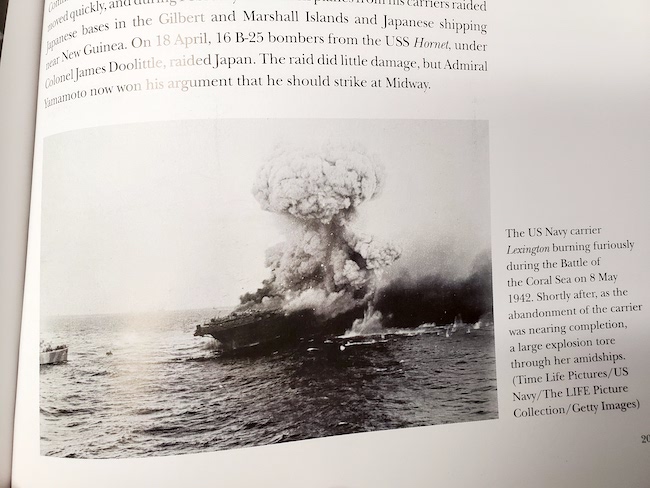 | A vendor at work, Burns & McDonnell gave out some books on WWII. I was looking through the book and I came across this photo along with a caption of the USS Lexington burning prior to sinking during the battle of the Coral Sea. Jim Smith was aboard this vessle when is was sunk. He was likely on the boat when this photo was taken. |