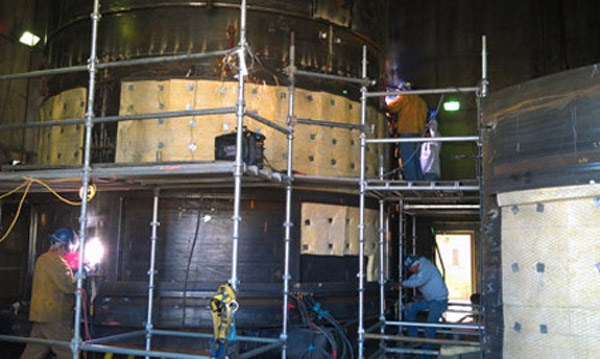The new stack was assembled in the opposite fashion. The new stack was brought in in thirds and then assembled on an assembly cart. This cart was then rolled into position under the liner and welded to it. The new stack was made from a high strength carbon steel (A-588) with a 1/16th inch wall paper of hastelloy (C-276) on the inside. Then once the carbon steel was welded together a 6" wide strip of hastelloy was welded over the joint giving a complete hastelloy interior of the new stack. Once the stack was assembled and put together, it was then raised into place in the same fashion that it was removed.