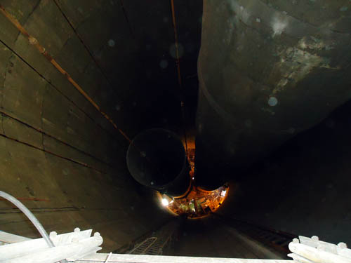 New liner being lifted up - notice the lifting rods and cables going down the center to hold up the floating scaffolding inside during construction |