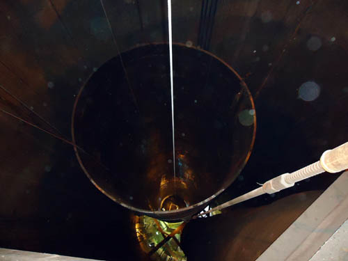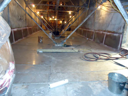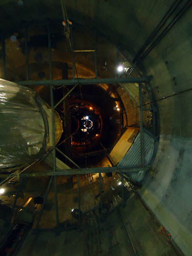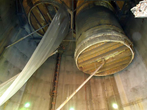New liner in construction. Liner assembly cart on left, floating scaffolding in side new liner suspended above where new can will roll into. |