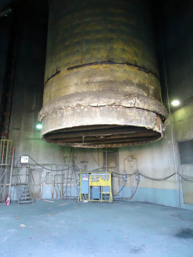 The chimney contains two stacks (one for unit 2 and one for unit 3). The stack was removed by placing hydraulic jacks on the chimney roof, and then running some steel jacking rods down the liner and attaching the rods onto some lifting lugs (seen here). Then the jacks lift the rods off of stop blocks and lower them the 20 inch stroke of the jack to another stop block. This process is repeated over and over until the heights are reached. The stack was lowered down the chimney until it was inches above the floor. Then 10 feet were cut off and the newly cut can was cut into thirds to get out of the chimney. |