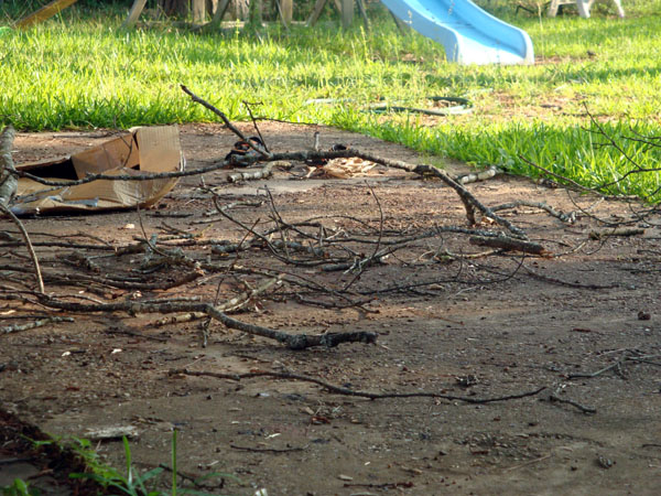 Then when I went in to the back yard, I found another blasted branch from the oak tree that had fallen. This one is slightly larger and longer than the other one. As you can see it landed in the fire pit and on top of the swing. The top part of the branch impacted the benches and broke into many pieces (not pictured) but the remaining part of the branch is ready to be burned. Last time I had to use an ax to chop it up, because I don't own a chain saw - and both of the batteries on the cordless saw were dead, and I was too lazy to string an extension cord out there to power the skill saw. Now I get to do it once more. The swing set is a standard construction with a 2" metal pipe running across the top of it. It now has a bend in the top of the swing. I have not taken care of it yet, anyone want to come over for another B-B-Q? Today when I got home from work I went out and mowed the grass, but after that I was soaking wet. While Terra is gone, I have a list of things that I need to get fixed or otherwise taken care of. Now I guess that I can add one more to that list.