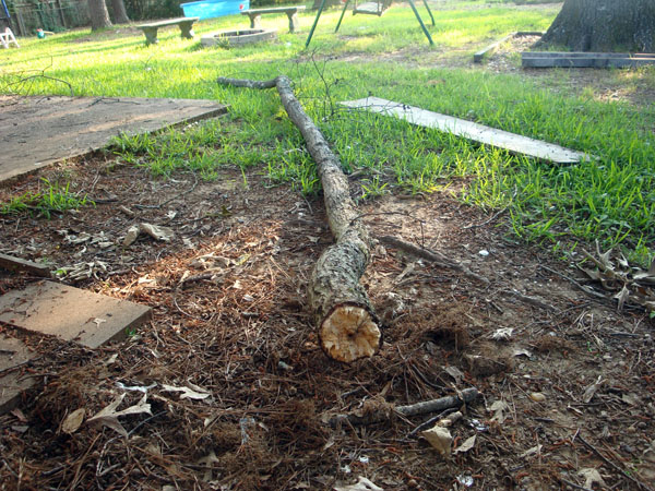 | OK, I am going to see if I can catch you up on some of the latest events. As you know (from other letters) we made a trip back to Arizona at the end of May for a bicycle trip. Well while we were out there some exciting weather happened around out home. When we returned home we found this branch laying on the ground in the back yard. We have an oak tree 15 feet from our house in our back yard that is about 6 feet in diameter. Every time the wind blows hard branches fall from the tree. I say that, but I have never seen it. I have just found them laying in the back yard when I return home from trips. For some reason these branches never fall when we are home. |