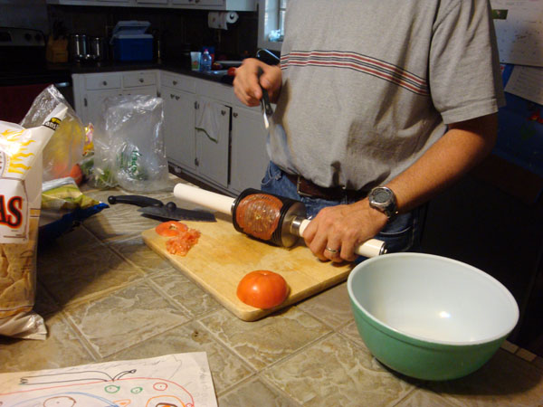 While we were in Arizona I was I was given a custom made Salsa chopper. It was conceived and designed by my father. Basically it consists of about 20 stainless steel disks (think pizza cutters) all arranged about .25" apart with some pvc spacers. It has a center axle with pvc handles such that it rotates. It does have some flaws, such that it is hard to sharpen, hard to clean, and when you chop items they just get stuck in between the disks. |