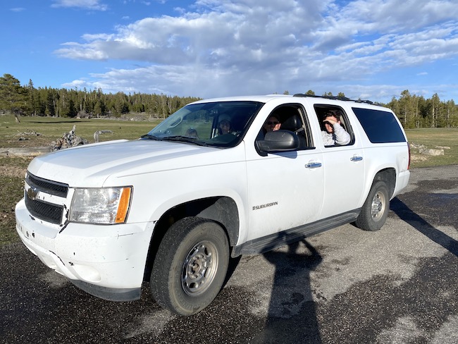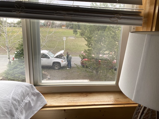 The next morning, we took changed the tire and when trying to take it to the shop, the car started and off we went. We went through out the rest of this day without any issues. The next morning we packed up our stuff (checked out of the house) and went to pick up the tire. The car again behaved normally. We put the fixed tire back on the car and drove around the park. After exiting the park we were driving along the Teton range and there was a bunch of people stopped. We joined them and stopped as well. It turned out there was a Grisly bear with two cubs eating an elk kill. After viewing this for 15 or so minutes, the car would not start again. AJ towed us off the road to the first place to pull over and we played with it again.