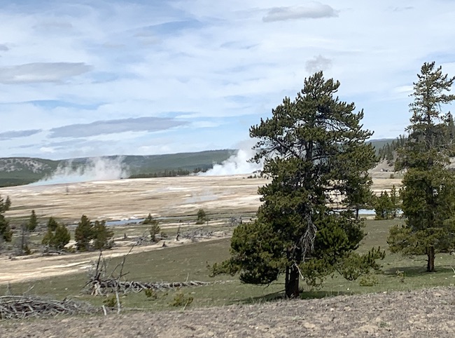 As we drove around, the National Park Service has built boardwalks around so that you can walk across them and view some the thermal features. The boardwalks are build above the ground to facilitate them being moved when the thermal features change. In fact a few of the parking lots we entered had wooden barriers around steam vents that were coming through the asphalt. The thermal features change from time to time as the magma/water shift underneath. |