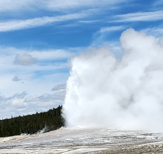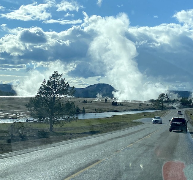 The vehicle saga will be detailed below. Shown above and to the right is Old Faithful. This geyser is not the largest, but it is the most regular. They predict its eruptions days in advance with a +/- 10 minute accuracy. It erupts about every 90 minutes. While we enjoyed it grandeur, we enjoyed more the smaller geysers that are found in parking lots, along the board walks, and the side of the road all over the park. These erupt at random and we caught several of these eruptions as we were passing by. They usually are a few feet in height, but some were taller than we were. |