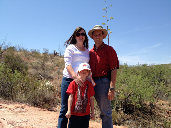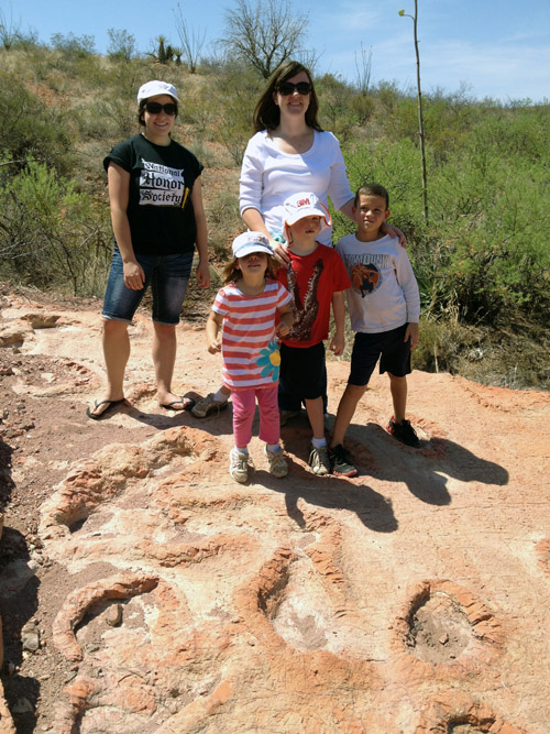 | While Karalyn was down, Terra and the kids took her along and went and played around doing lots of pretty neat things. Unfortunately I was involved in the labors of working and missed the most of it. Poor Karalyn also picked about the hottest time of the year to come and visit. It was just before the monsoons had started and the temperatures were at the highest of the summer. Oh well, that is how life goes in the desert (particularly during the summer time). One thing that I did manage to do was to go out in the hills between Cascabel and Reddington and see if we couldn't find some dinosaur tracks. I had heard rumors that there were some up the washes in this area and if you chose the "correct" fork in the wash you might find some. Well we took the bronco up the washes, and managed to find these specimens that we are standing on. |
