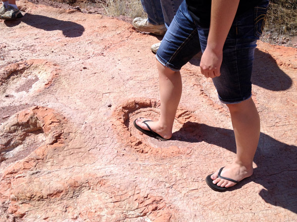I don't know what type of tracks these are, but they measured about 16" across. What it looks like is that this area was wet (either near a pond or bank of a river) and some animals walked through the area. This walking on wet dirt/clay caused the edges of their foot prints to protrude up and curl up around their feet. Similar to what happens at a beach when you take a step in the wet sand. This particular area was in some rocks that had moved and were slanted at about a 20 degree angle protruding out of the sandy wash. You could also see where the top layers of rock were missing. It was rather fascinating, and I would love the opportunity to go back up and explore some other fingers of the washes in this area. I suspect that north of south of this location would yield similar tracks. |