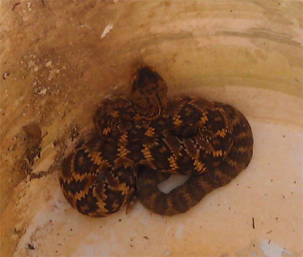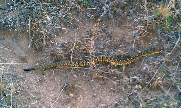 We went out to the rabbit house and found him again and started the great dance trying not to upset it, while not touching it, and all the time poking and prodding it with sticks to get it to go into a 5-gallon bucket. We finally managed to get it into the bucket, and Brittney wouldn't have been to impressed with the methods imployed, but the snake never displayed any inclination of it being threatened, and for the most part seemed to cooperate. AJ finally managed to pin its mid section with some angle iron and we got the bucket in front of the snake, and AJ directed it in. Once in the bucket we put a lid on it and drove the snake out to the back road to San Manuel and found the first spot to pull off the road and let it go. It turned out to be a Black-tailed rattle snake with 4-5 rattles on its tail. |