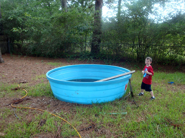 This is a bad picture, but there were probably between 300-500 of these little tadpoles in there. I decided that dumping it would kill the tadpoles and the tadpoles most likely eat the mosquito larva, so I left them. I am excited to see how many frogs that we end up having in the back yard from this little experiment. The kids have also taken a liking to them and routinely go out there with cups and catch a few watch them for a while, try to sneak them in the house and then end up putting them back into their container waiting for them to become frogs. If I were a good anphibianologist then I might be able to identify what species of frogs these are, but as I am not, we will just have to wait and see what type of frogs they become. |